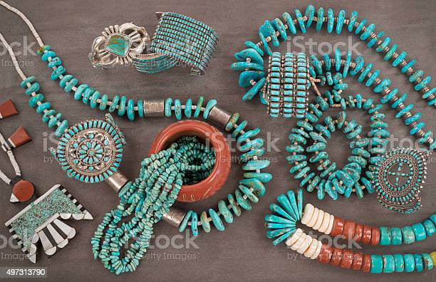 A collection of Vintage Native American Jewelry made of turquoise, silver, pipe stone and Heishe beads. A Santo Domingo “Depression Era” Necklace, and Turquoise “Nugget” necklaces with silver beads, and Zuni and Navajo “Cuff” Bracelets, on a Grey Slate Background.